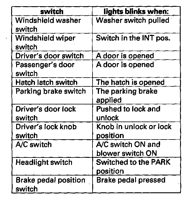 3. Operate the switches listed: If the circuit is OK, the spotlight and ceiling light will blink once. If the circuit is faulty, the lights will not blink.