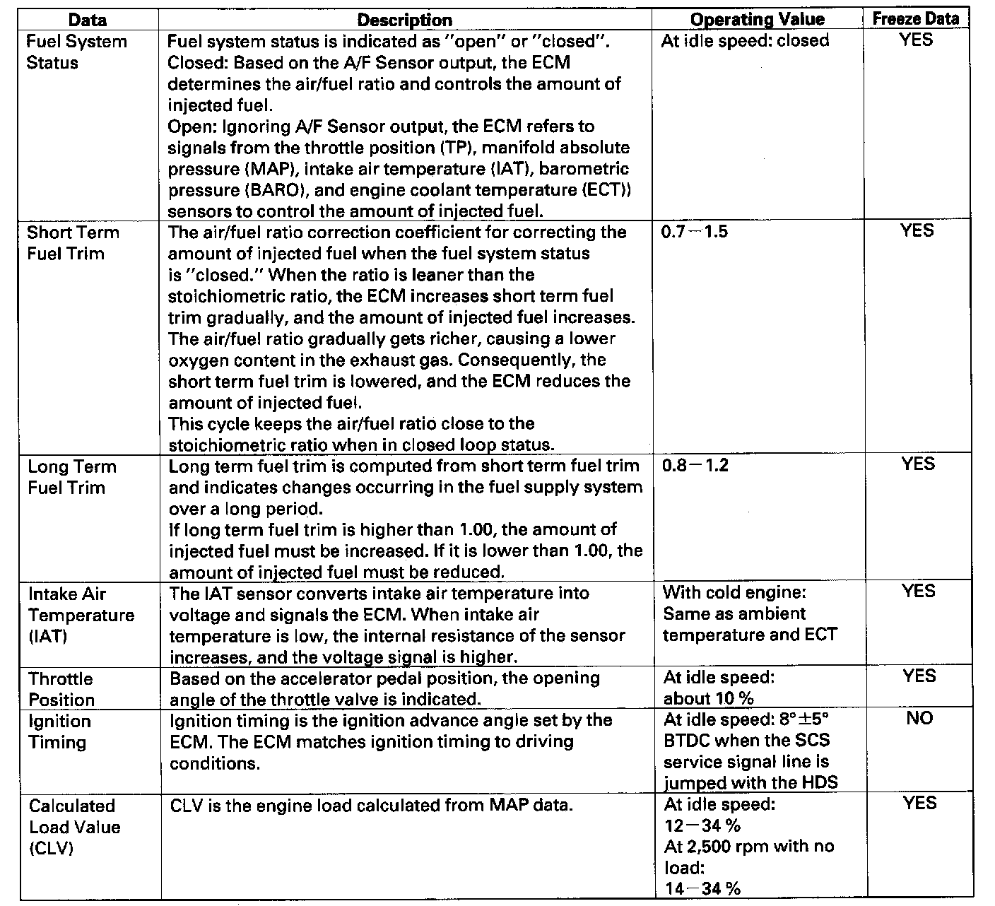 You can retrieve data from the ECM by connecting the HDS or a scan tool to the data link connector (DLC). The items listed in the table conform to SAE recommended practice. The HDS also reads data beyond that recommended by SAE to help you find the causes of intermittent problems.