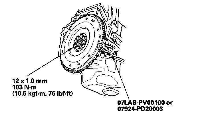 Install the special tool, then torque the flywheel mounting bolts in a crisscross pattern in several steps.
