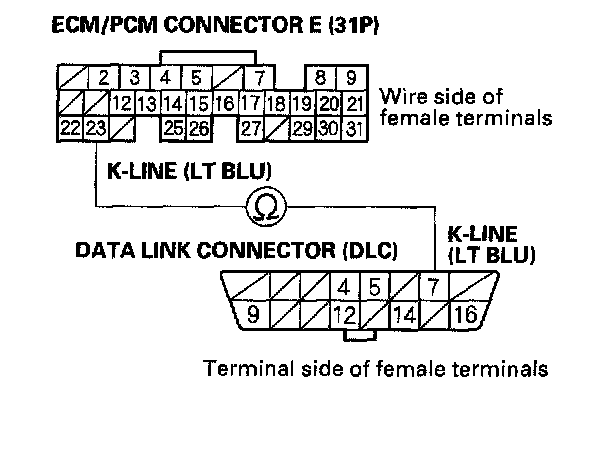 NO - Repair open in the wire between DLC terminal No.7 and the ECM/PCM (E23). After repairing the wire, check for a DTC with the Honda PGM Tester or the HDS, then go to the DTC Troubleshooting index. Diagnostic Trouble Code Descriptions