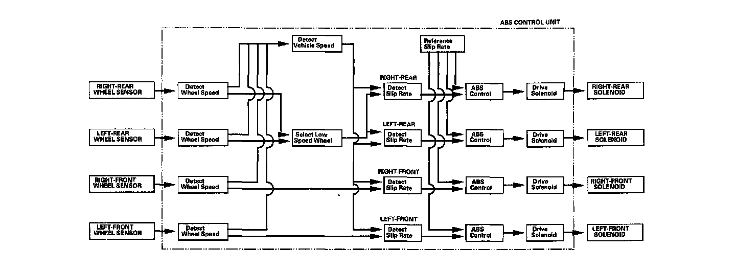 The ABS control unit calculates the slip rate of each wheel, and transmits the control signal to the modulator unit solenoid valve when the slip rate is high.