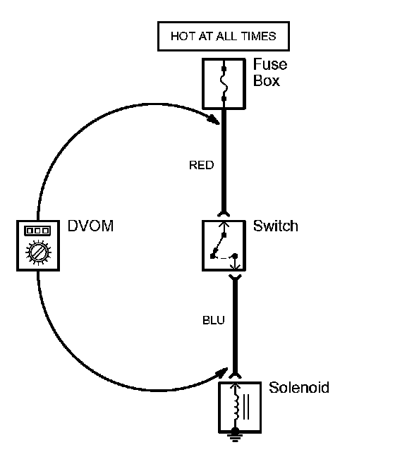1. Place the digital volt/ohmmeter (DVOM) in the appropriate DC volts range. Connect the positive lead to the end of the wire (or to the connector or switch) closest to the battery.