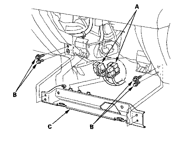 4. Remove the relays (A), then remove the bolts (B) and the glove box frame (C).