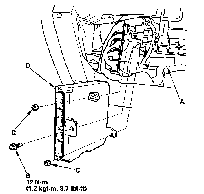 6. Remove the nuts (C), then remove the ECM/PCM (D).