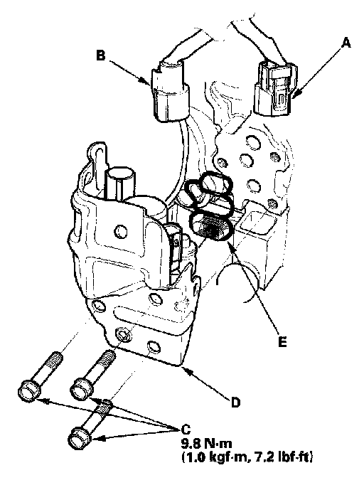 VTEC Solenoid Valve Removal/Installation1. Disconnect the VTEC solenoid valve connector (A) and the VTEC oil pressure switch connector (B).