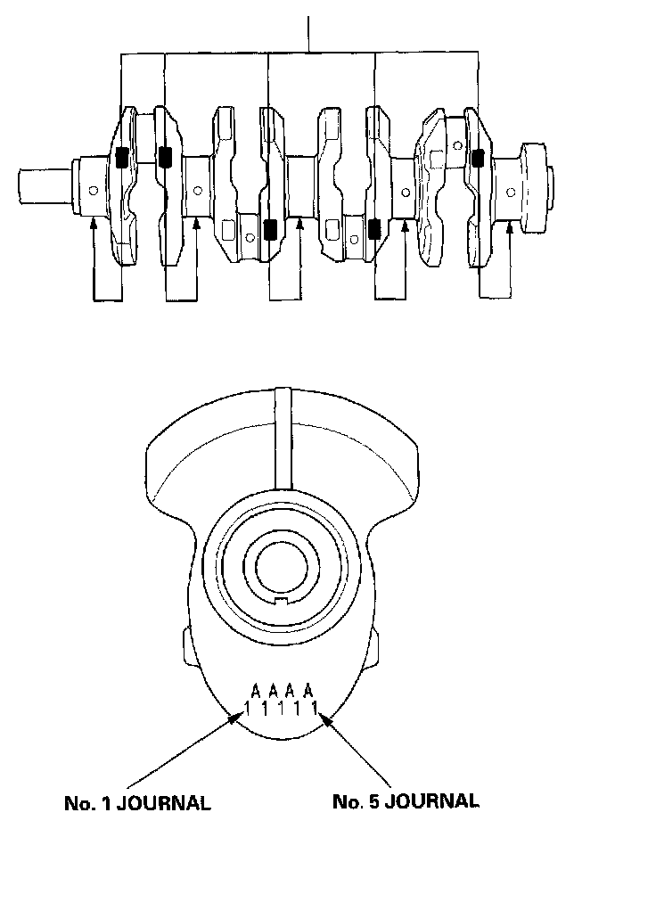 1. Numbers or letters or bars have been stamped on the end of the block as a code for the size of each of the five main journal bores. Write down the crank bore codes. If you can't read the codes because of accumulated dirt and dust, do not scrub them with a wire brush or scraper. Clean them only with solvent or detergent.