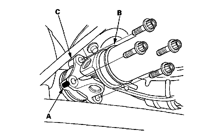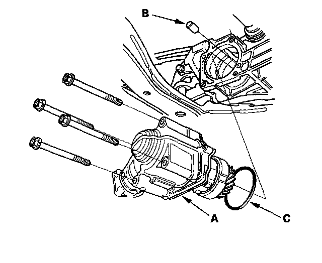 6. Remove the transfer assembly (A), dowel pin (B), and O-ring (C).