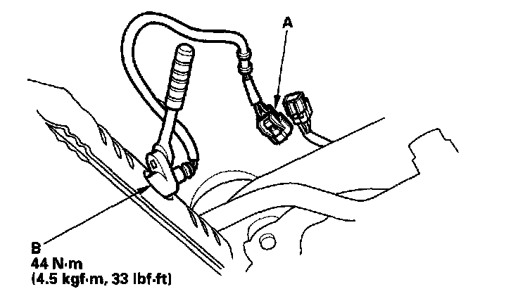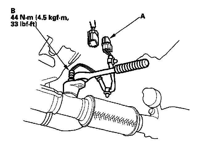 1. Disconnect the primary HO(2)S 4P connector (A), then remove the primary HO(2)S (B).