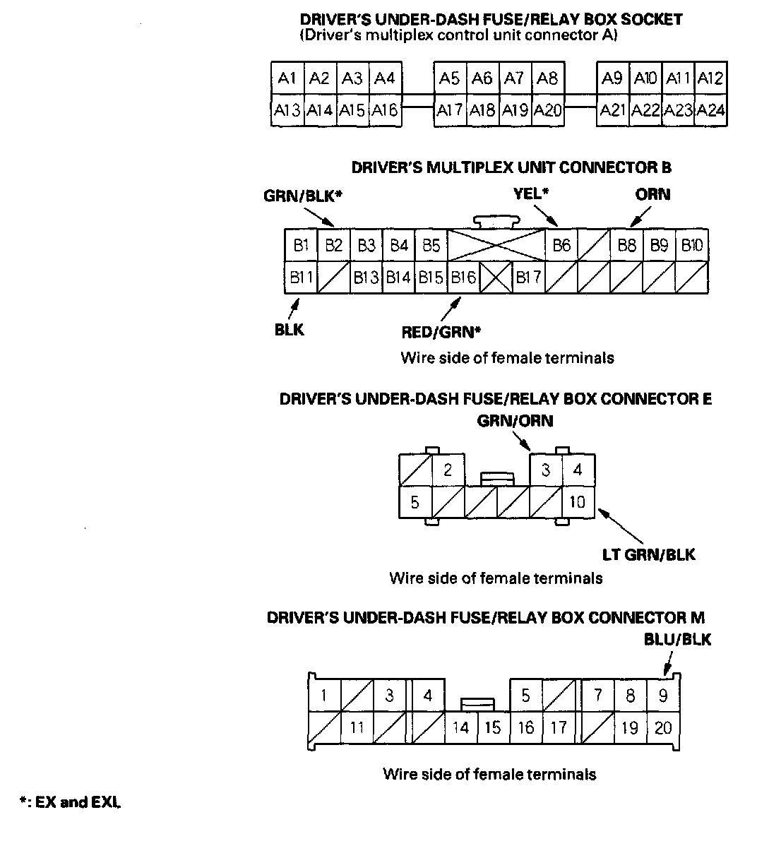 4. With the driver's multiplex control unit still disconnected, make these input tests at the connector and driver's under-dash fuse/relay box sockets.
