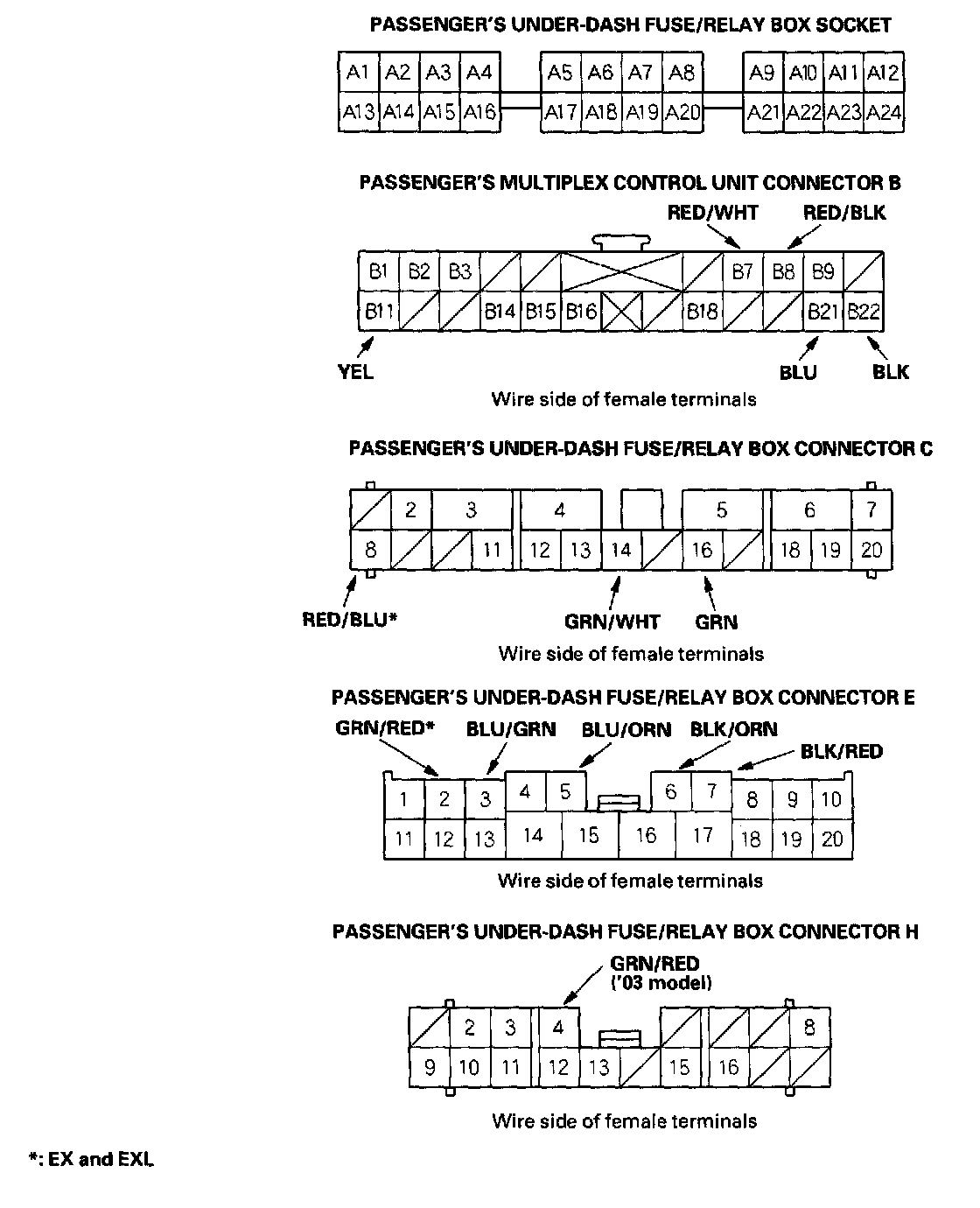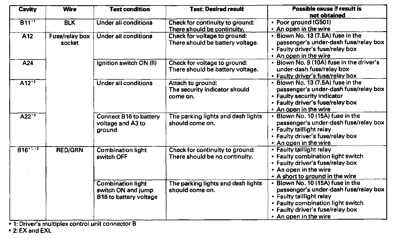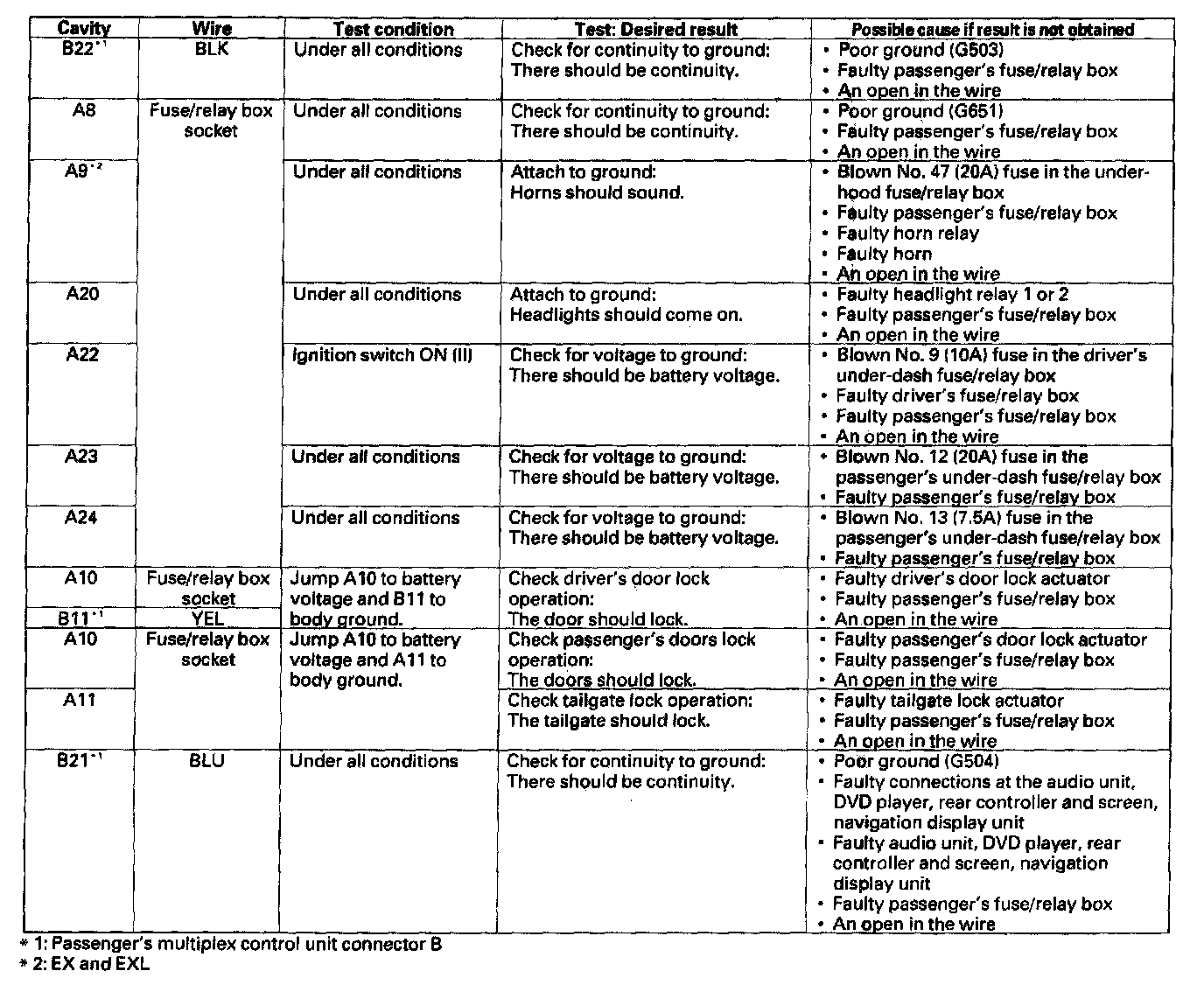 8. With the passenger's multiplex control unit still disconnected, make these input tests at the connectors and the passenger's under-dash fuse/relay box sockets.