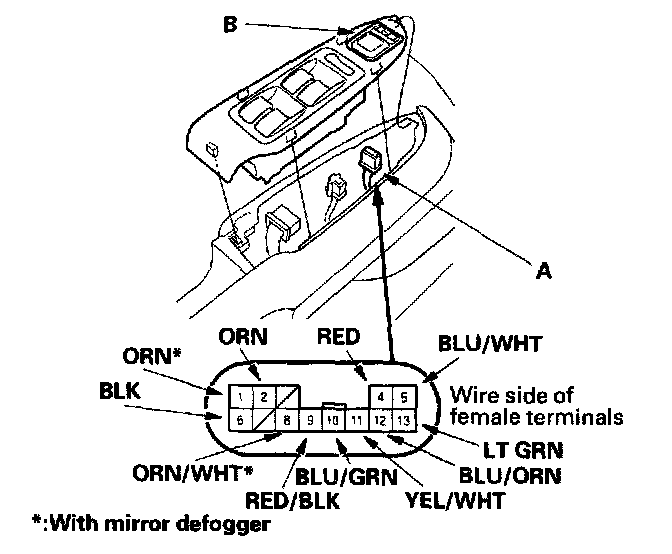 2. Disconnect the 13P connector (A) from the power mirror switch (B), and inspect the terminals. If OK, go to step 3.