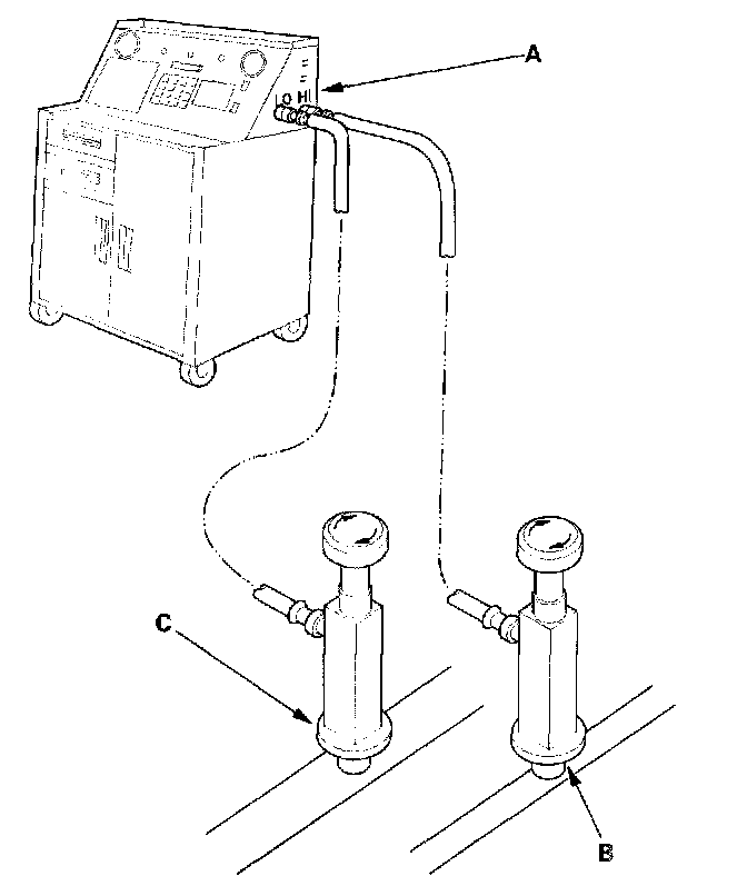 1. Connect a R-134a refrigerant recovery/recycling/charging station (A) to the high-pressure service port (B) and the low-pressure service port (C), as shown, following the equipment manufacturer's instructions.