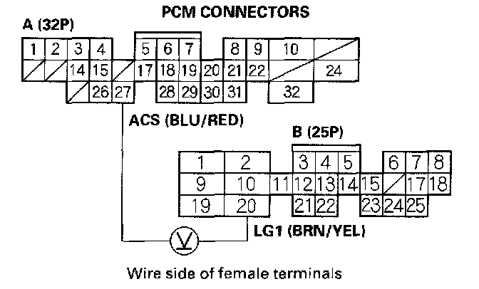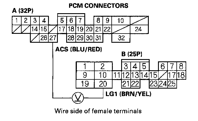 4. Measure voltage between PCM connector terminals A27 and B20.