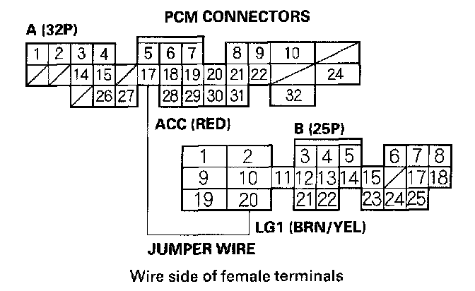 8. Momentarily connect PCM connector terminals A17 and B20 with a jumper wire several times.