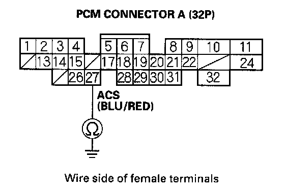 14. Check for continuity between body ground and PCM connector terminal A27.