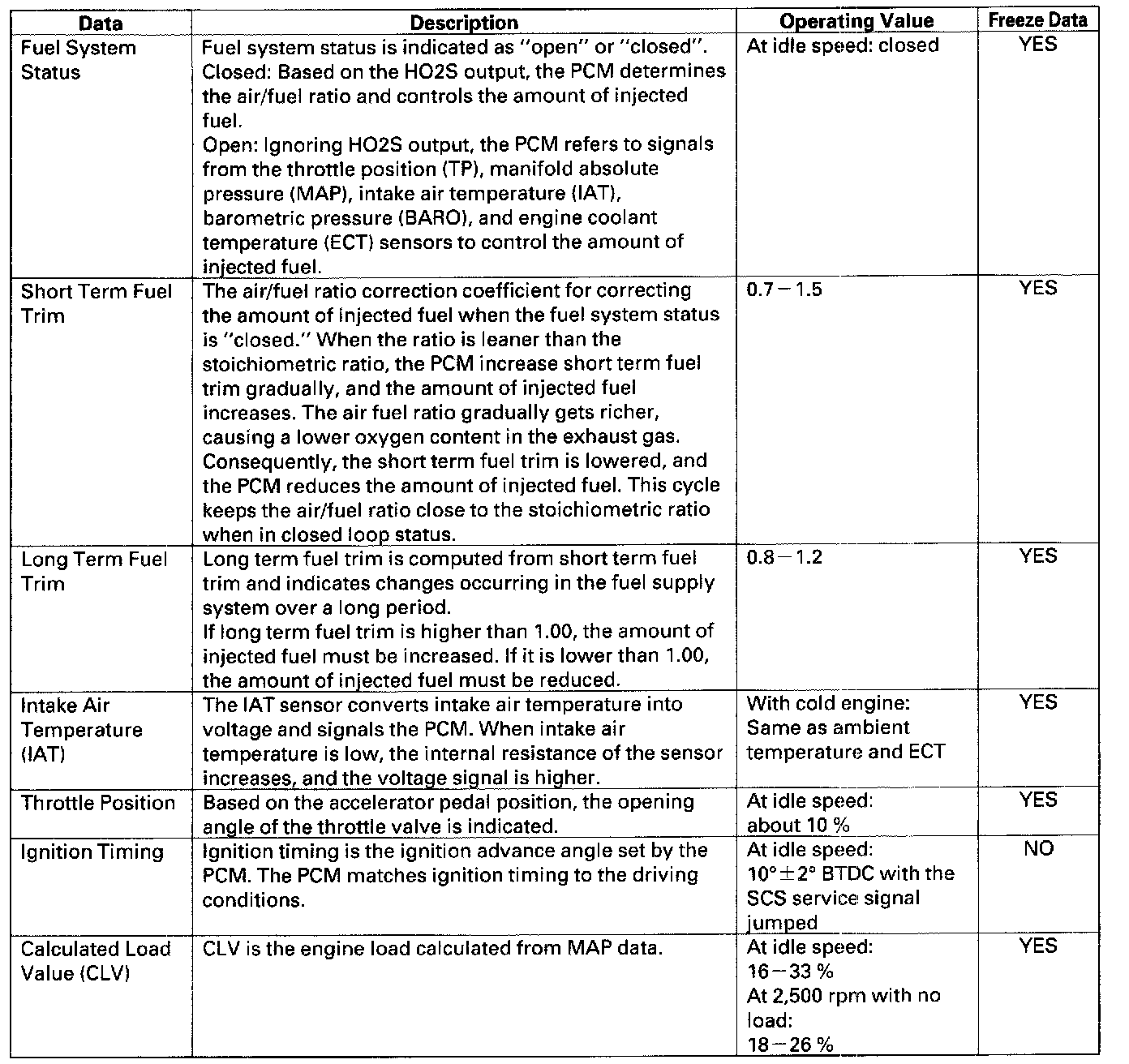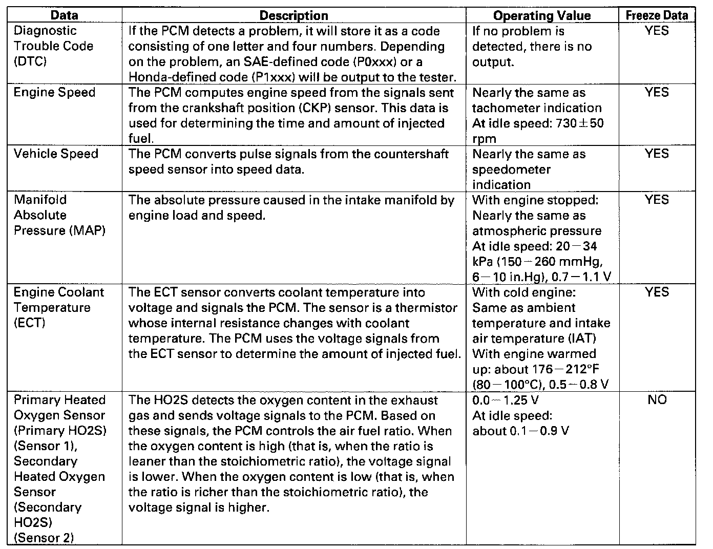 Home >> Honda >> 2004 >> Pilot V6-3.5L >> Repair and Diagnosis >> Powertrain Management >> Computers and Control Systems >> Testing and Inspection >> Scan Tool Testing and Procedures >> Normal Scan Data Values