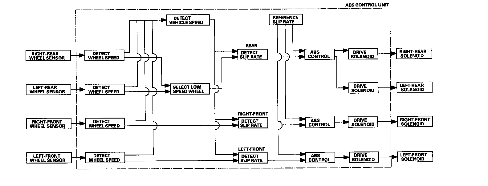 The ABS control unit detects the wheel speed based on the wheel sensor signal it received, then it calculates the vehicle speed based on the detected wheel speed. The control unit detects the vehicle speed during deceleration based on the rate of deceleration.