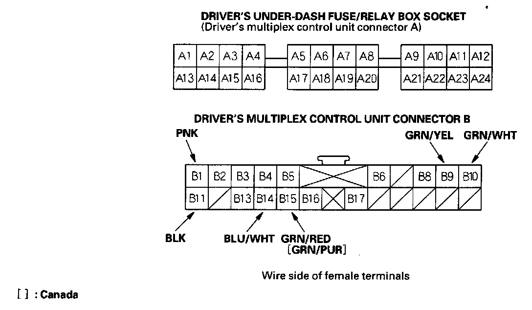 4. With the driver's multiplex control unit still disconnected, make these input tests at the connector and driver's under-dash fuse/relay box sockets.