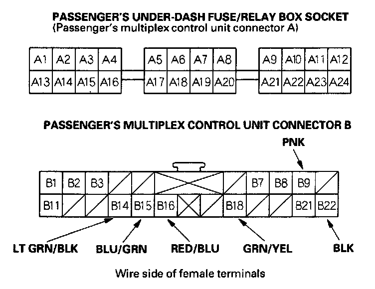 4. With the passenger's multiplex control unit still disconnected, make these input tests at the connector and passenger's under-dash fuse/relay box sockets.