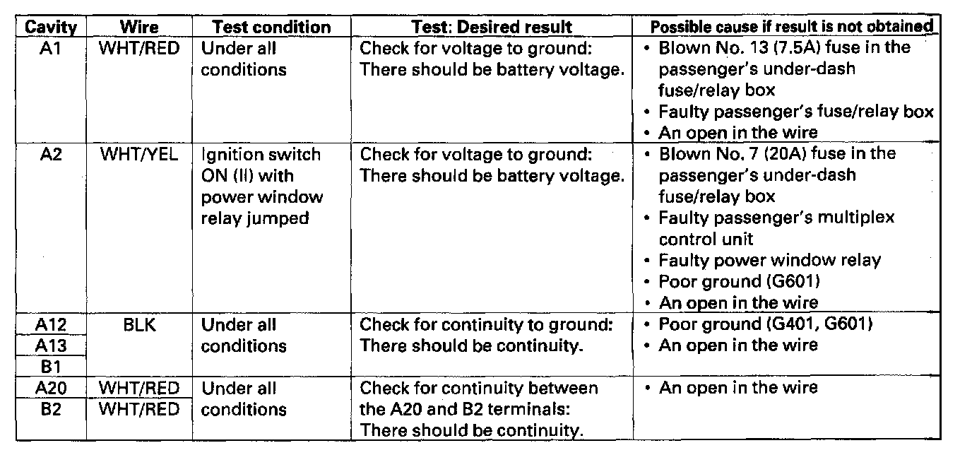 NOTE: For the terminals A4, A5, A10, A11, and A14, refer to the power window control unit input test.