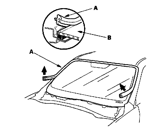 2. Remove the molding (A) from the edge of the windshield (B). If necessary, cut the molding with a utility knife.