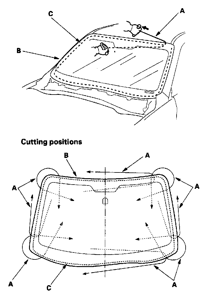 6. With a helper on the outside, pull the piano wire (A) back and forth in a sawing motion. Hold the piano wire as close to the windshield (B) as possible to prevent damage to the body and dashboard. Carefully cut through the rubber dam and adhesive (C) around the entire windshield.