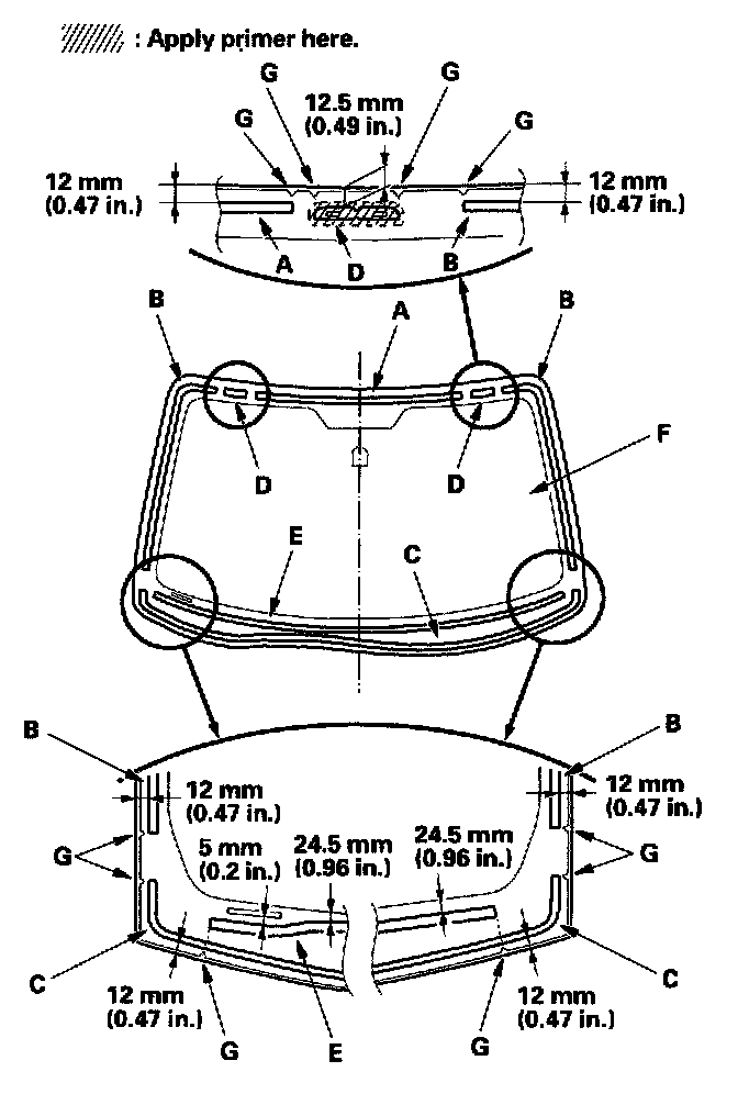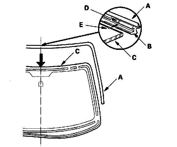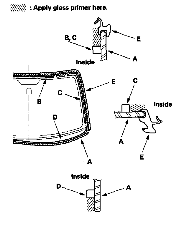 18. With a sponge, apply a light coat of glass primer around the edge of the windshield (A) between the upper rubber dam (B), side rubber dam (C), lower rubber dam (D), and molding (E) as shown, then lightly wipe it off with gauze or cheesecloth: