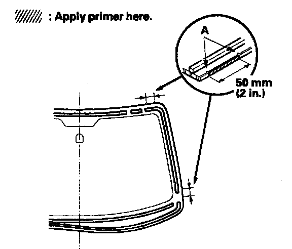12. Apply primer (3M N-200, or equivalent) to the edge of the windshield between the alignment marks (A). Be careful not to touch the windshield where adhesive will be applied.