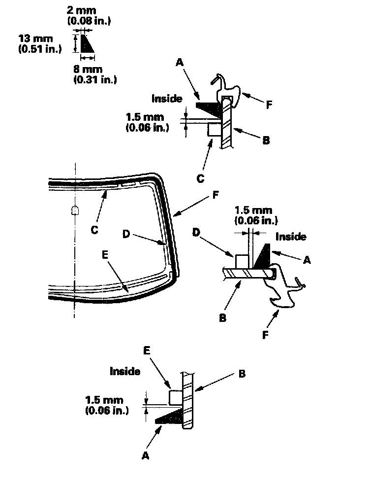 11. Attach the upper rubber dam (A), side rubber dam (B), and lower rubber dam (C) with adhesive tape (NITTO 501M, or equivalent). Apply primer (3M N-200, or equivalent) where the clips (D) will be applied, then attach the clips with adhesive tape (3M 4216, or equivalent) and dashboard seal (E) to the inside face of the windshield (F) as shown: