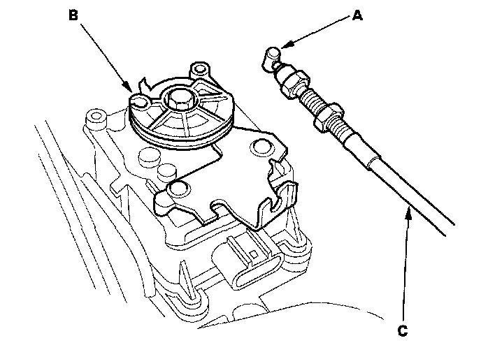 2. Disconnect the actuator cable end (A) from the output linkage (B), and remove the cable (C) from the cruise control actuator.