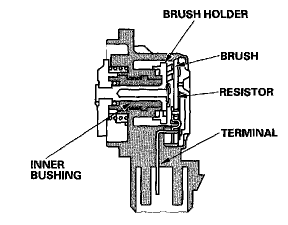 The TP sensor is a potentiometer connected to the throttle valve shaft. As the throttle position changes, the sensor varies the signal voltage to the ECM. The TP sensor is not replaceable apart from the throttle body.