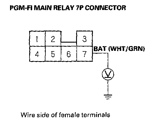 3. Measure voltage between body ground and PGM-FI main relay 7P connector terminal No. 7.