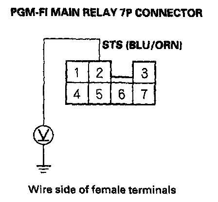 7. Push the clutch pedal in, then turn the ignition switch ON (II), and press the engine start button. Measure voltage between body ground and PGM-FI main relay 7P connector terminal No. 2.