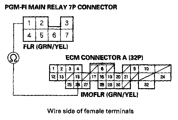 10. Check for continuity between PGM-FI main relay 7P connector terminal No. 1 and ECM connector terminal A15.