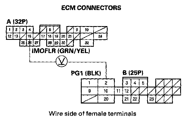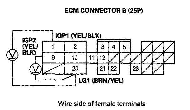 12. Turn the ignition switch ON (II), and measure voltage between ECM connector terminals B1 and B20, and between B9 and B20 individually.