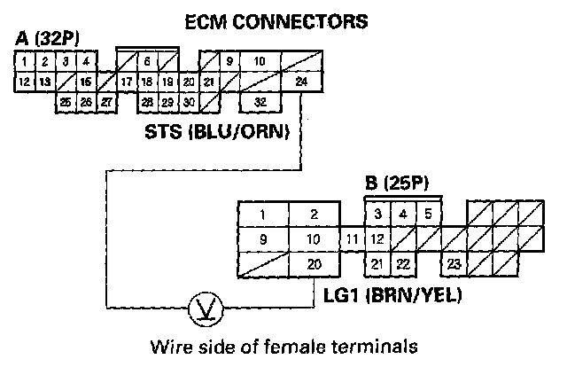 1. Measure voltage between ECM connector terminals A24 and B20 with the ignition switch in the ON (II) position and the engine start button pressed.