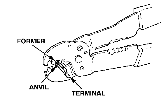 4. Position the terminal in the crimping tool slot with the solid portion of the terminal toward the anvil and the open section toward the former.