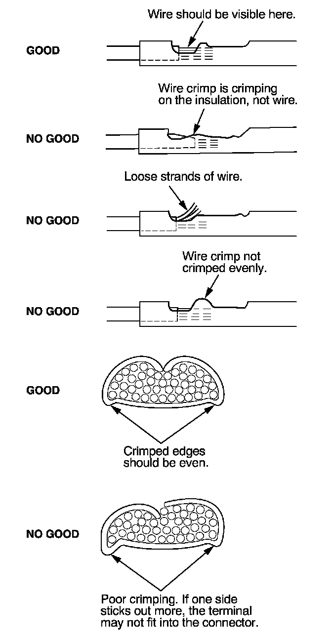 8. Inspect the quality of the wire crimp. If it has any of the following NO GOOD crimps, cut it off and start over.
