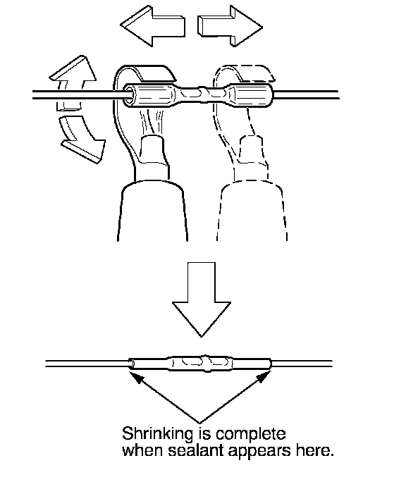 13. Plug in the heat gun, and turn it on. Start at the middle of the splice connector, and move the gun toward the ends as the tube shrinks. Apply heat evenly by rotating the curved heat spreader around the splice connector. Shrinking is complete when a small amount of sealant appears at each end of the tube.