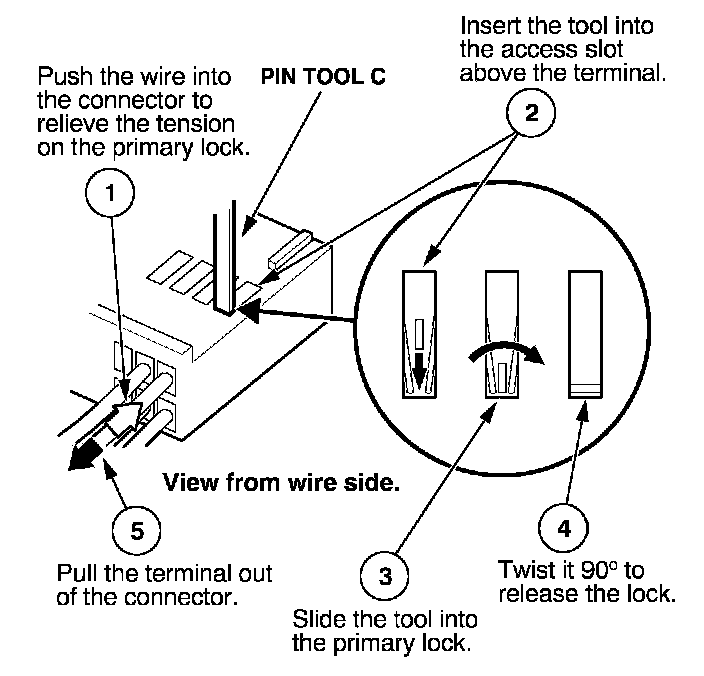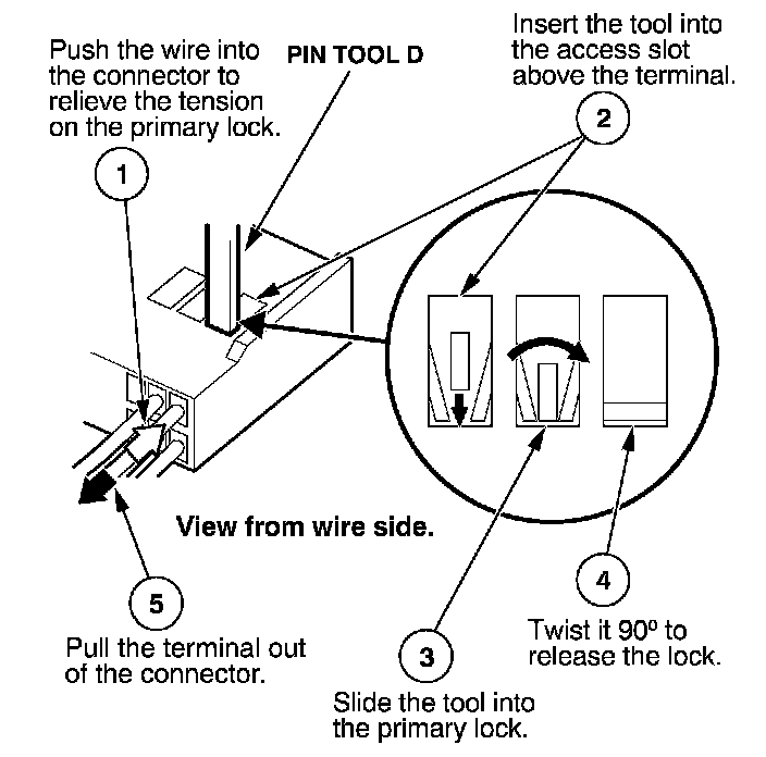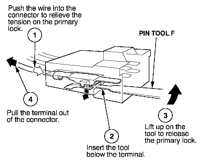 Before you begin, inspect the wire you are about to repair for damage and length. Make sure the wire will be long enough to make a terminal repair without stretching it when you reinstall the terminal in the connector. If the wire is too short, or if access to the connector is too restricted to make a terminal repair, you may need to install a pigtail terminal (a short length of wire with a factory-crimped terminal on it). Refer to HOW TO INSTALL PIGTAIL TERMINALS.