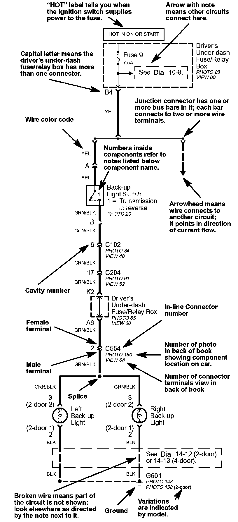 Other circuits may share power or ground terminals or wiring with the circuit shown. A wire that connects one circuit to another for example is cut short and has an arrowhead at the end of it pointing in the direction of current flow. Next to the arrowhead is the name of the circuit or component which shares that wiring. To quickly check shared wiring check the operation of a component it serves. If that component works you know the shared wiring is OK.