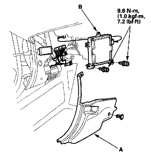 2. Remove the left side kick panel (A) to expose the ECM (B).