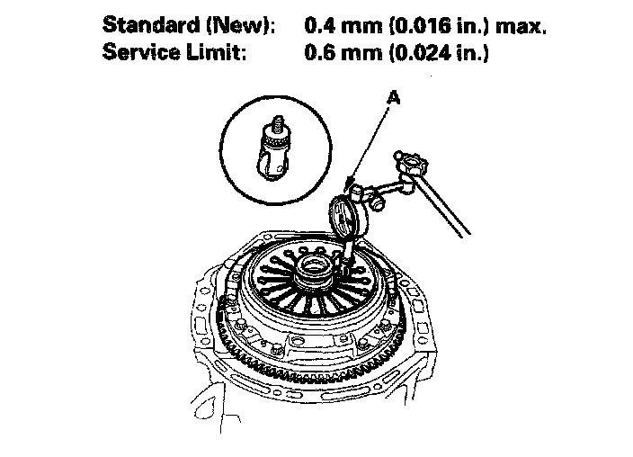 Check the height-variation of the diaphragm spring fingers using the dial indicator (A). If the variation is more than the service limit, replace the pressure plate