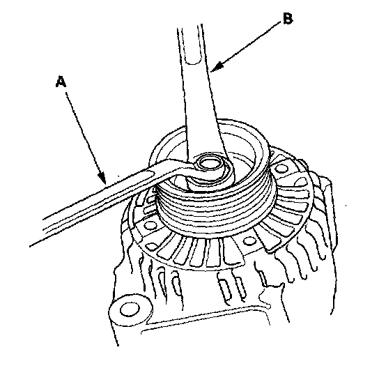 3. If the front bearing needs replacing, remove the pulley locknut with a 10 mm wrench (A) and a 22 mm wrench (B). If necessary, use an impact wrench.