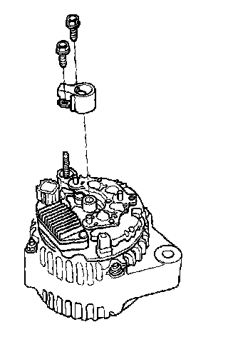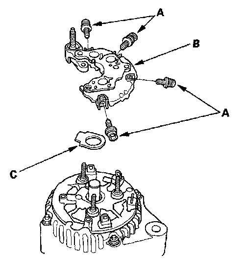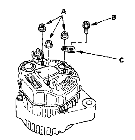 4. Remove the three flange nuts (A) and the screw (B) from the alternator, then remove the plate terminal (C).