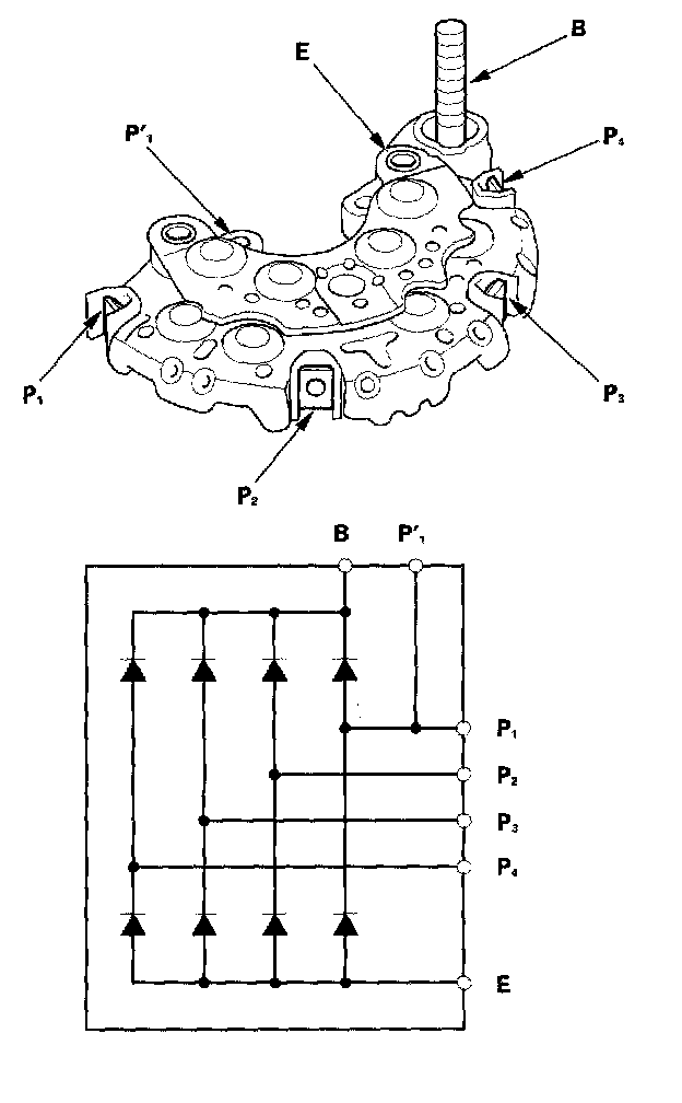 18. Check for continuity in each direction, between the B terminal and P terminals, and between the E terminal and P terminals of each diode pair. All diodes should have continuity in only one direction. Because the rectifier diodes are designed to allow current to pass in one direction, and the rectifier is made up of eight diodes (four pairs), you must test each diode in both directions for continuity with an ohmmeter that has diode checking capability: a total of 16 checks.