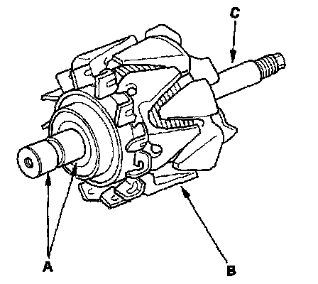 21. Then check that there is no continuity between each slip ring and the rotor (B) and the rotor shaft (C).