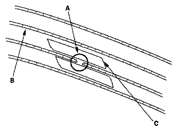 2. Carefully mask above and below the broken portion of the defogger wire (B) with cellophane tape (C).