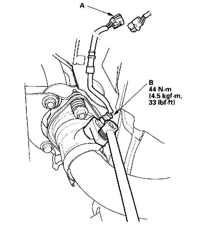 1. Disconnect the A/F sensor 4P connector (A), then remove the A/F sensor (B).