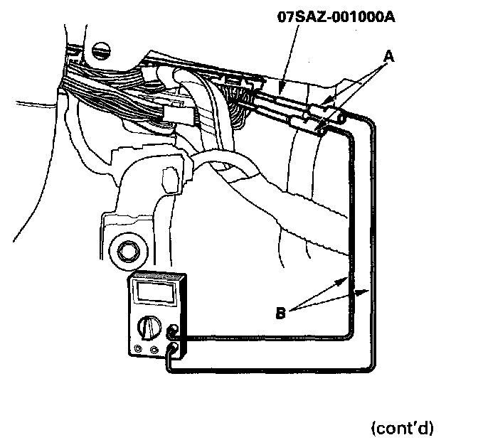 3. If you cannot get to the wire side of the connector or the wire side is sealed (A), disconnect the connector, and probe the terminals (B) from the terminal side. Do not force the probe into the connector.